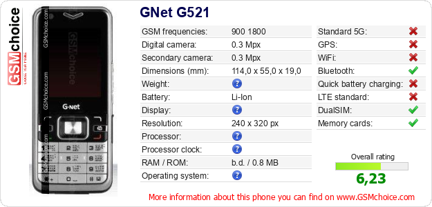 Do you have your website? Do you want to insert information about basic phone data of GNet G521 somewhere? It is very easy. You can download the picture, or copy and paste the code below on the page:Pasting this code will display the following image: