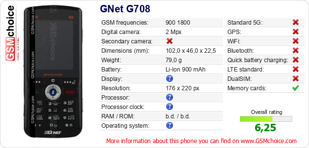 Do you have your website? Do you want to insert information about basic phone data of GNet G708 somewhere? It is very easy. You can download the picture, or copy and paste the code below on the page:Pasting this code will display the following image: