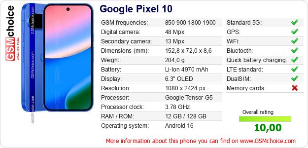 Do you have your website? Do you want to insert information about basic phone data of Google Pixel 10 somewhere? It is very easy. You can download the picture, or copy and paste the code below on the page:Pasting this code will display the following image: