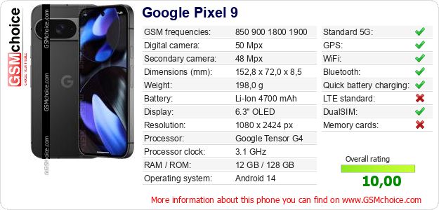Do you have your website? Do you want to insert information about basic phone data of Google Pixel 9 somewhere? It is very easy. You can download the picture, or copy and paste the code below on the page:Pasting this code will display the following image: