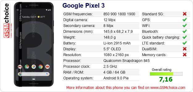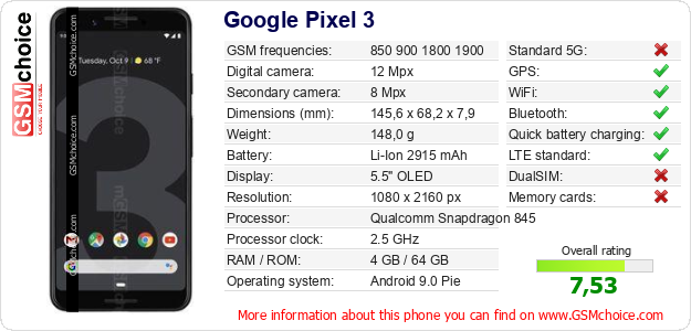 Do you have your website? Do you want to insert information about basic phone data of Google Pixel 3 somewhere? It is very easy. You can download the picture, or copy and paste the code below on the page:Pasting this code will display the following image: