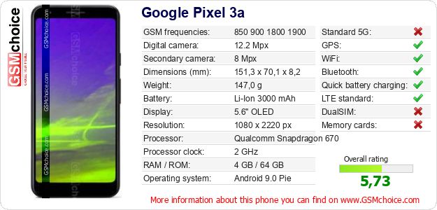Do you have your website? Do you want to insert information about basic phone data of Google Pixel 3a somewhere? It is very easy. You can download the picture, or copy and paste the code below on the page:Pasting this code will display the following image: