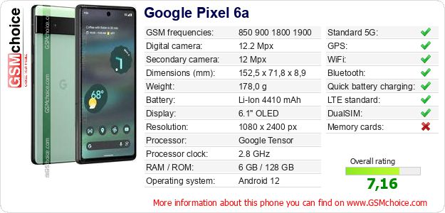 Do you have your website? Do you want to insert information about basic phone data of Google Pixel 6a somewhere? It is very easy. You can download the picture, or copy and paste the code below on the page:Pasting this code will display the following image: