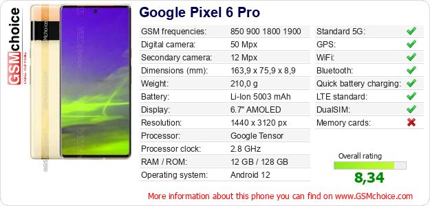 Do you have your website? Do you want to insert information about basic phone data of Google Pixel 6 Pro somewhere? It is very easy. You can download the picture, or copy and paste the code below on the page:Pasting this code will display the following image:
