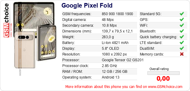 Do you have your website? Do you want to insert information about basic phone data of Google Pixel Fold somewhere? It is very easy. You can download the picture, or copy and paste the code below on the page:Pasting this code will display the following image: