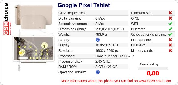 Do you have your website? Do you want to insert information about basic phone data of Google Pixel Tablet somewhere? It is very easy. You can download the picture, or copy and paste the code below on the page:Pasting this code will display the following image: