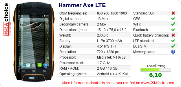 Do you have your website? Do you want to insert information about basic phone data of Hammer Axe LTE somewhere? It is very easy. You can download the picture, or copy and paste the code below on the page:Pasting this code will display the following image: