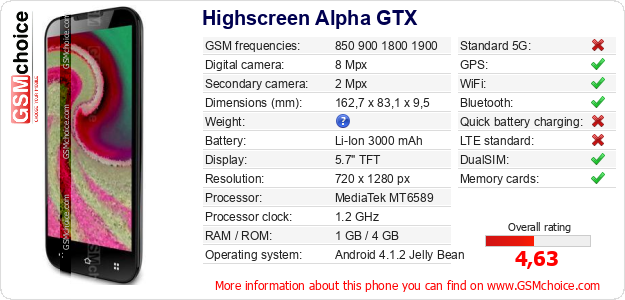 Do you have your website? Do you want to insert information about basic phone data of Highscreen Alpha GTX somewhere? It is very easy. You can download the picture, or copy and paste the code below on the page:Pasting this code will display the following image: