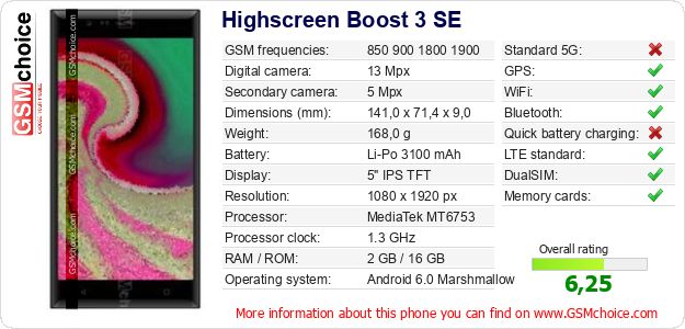 Do you have your website? Do you want to insert information about basic phone data of Highscreen Boost 3 SE somewhere? It is very easy. You can download the picture, or copy and paste the code below on the page:Pasting this code will display the following image: