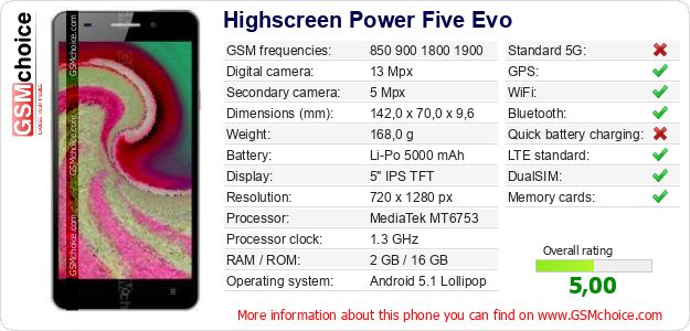 Do you have your website? Do you want to insert information about basic phone data of Highscreen Power Five Evo somewhere? It is very easy. You can download the picture, or copy and paste the code below on the page:Pasting this code will display the following image: