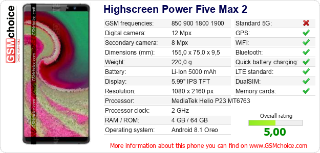 Do you have your website? Do you want to insert information about basic phone data of Highscreen Power Five Max 2 somewhere? It is very easy. You can download the picture, or copy and paste the code below on the page:Pasting this code will display the following image: