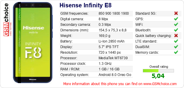 Do you have your website? Do you want to insert information about basic phone data of Hisense Infinity E8 somewhere? It is very easy. You can download the picture, or copy and paste the code below on the page:Pasting this code will display the following image:
