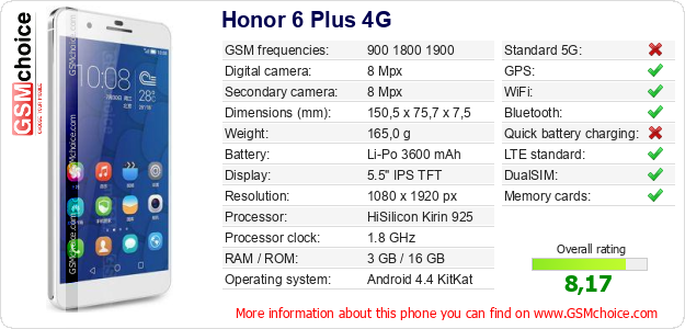 Do you have your website? Do you want to insert information about basic phone data of Honor 6 Plus 4G somewhere? It is very easy. You can download the picture, or copy and paste the code below on the page:Pasting this code will display the following image: