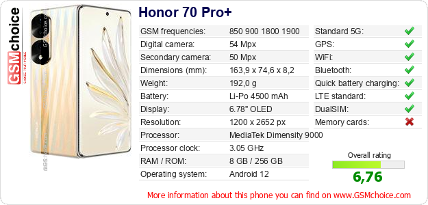 Do you have your website? Do you want to insert information about basic phone data of Honor 70 Pro+ somewhere? It is very easy. You can download the picture, or copy and paste the code below on the page:Pasting this code will display the following image: