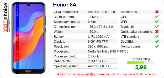 Do you have your website? Do you want to insert information about basic phone data of Honor 8A somewhere? It is very easy. You can download the picture, or copy and paste the code below on the page:Pasting this code will display the following image: