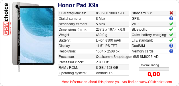 Do you have your website? Do you want to insert information about basic phone data of Honor Pad X9a somewhere? It is very easy. You can download the picture, or copy and paste the code below on the page:Pasting this code will display the following image: