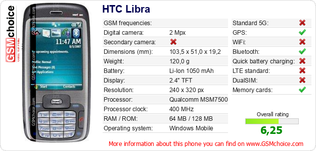 Do you have your website? Do you want to insert information about basic phone data of HTC Libra somewhere? It is very easy. You can download the picture, or copy and paste the code below on the page:Pasting this code will display the following image: