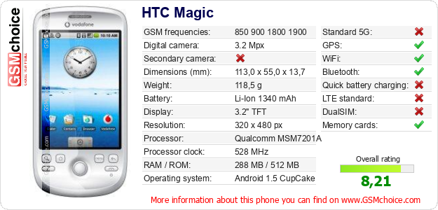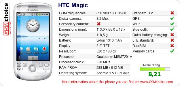 Do you have your website? Do you want to insert information about basic phone data of HTC Magic somewhere? It is very easy. You can download the picture, or copy and paste the code below on the page:Pasting this code will display the following image: