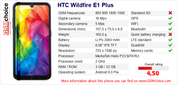 Do you have your website? Do you want to insert information about basic phone data of HTC Wildfire E1 Plus somewhere? It is very easy. You can download the picture, or copy and paste the code below on the page:Pasting this code will display the following image: