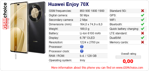 Do you have your website? Do you want to insert information about basic phone data of Huawei Enjoy 70X somewhere? It is very easy. You can download the picture, or copy and paste the code below on the page:Pasting this code will display the following image: