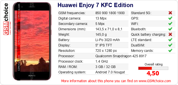 Do you have your website? Do you want to insert information about basic phone data of Huawei Enjoy 7 KFC Edition somewhere? It is very easy. You can download the picture, or copy and paste the code below on the page:Pasting this code will display the following image:
