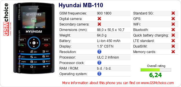 Do you have your website? Do you want to insert information about basic phone data of Hyundai MB-110 somewhere? It is very easy. You can download the picture, or copy and paste the code below on the page:Pasting this code will display the following image: