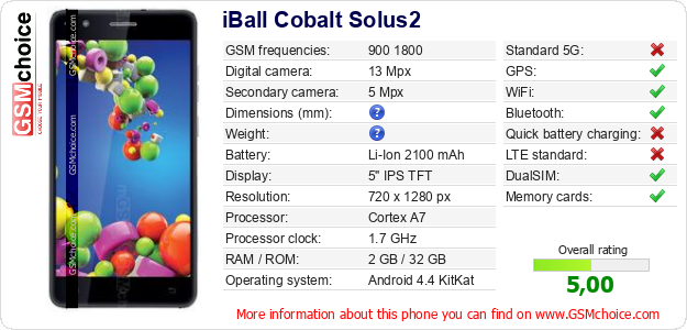 Do you have your website? Do you want to insert information about basic phone data of iBall Cobalt Solus2 somewhere? It is very easy. You can download the picture, or copy and paste the code below on the page:Pasting this code will display the following image: