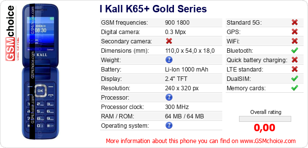 Do you have your website? Do you want to insert information about basic phone data of I Kall K65+ Gold Series somewhere? It is very easy. You can download the picture, or copy and paste the code below on the page:Pasting this code will display the following image: