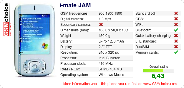 Do you have your website? Do you want to insert information about basic phone data of i-mate JAM somewhere? It is very easy. You can download the picture, or copy and paste the code below on the page:Pasting this code will display the following image: