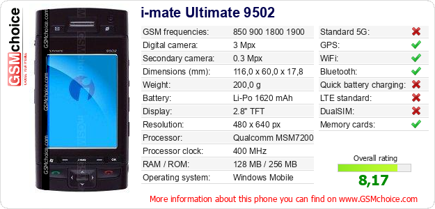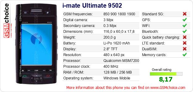 Do you have your website? Do you want to insert information about basic phone data of i-mate Ultimate 9502 somewhere? It is very easy. You can download the picture, or copy and paste the code below on the page:Pasting this code will display the following image: