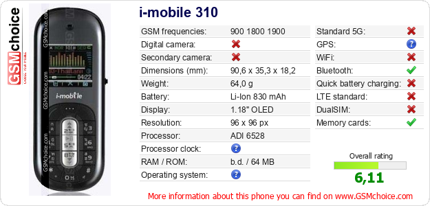 Do you have your website? Do you want to insert information about basic phone data of i-mobile 310 somewhere? It is very easy. You can download the picture, or copy and paste the code below on the page:Pasting this code will display the following image:
