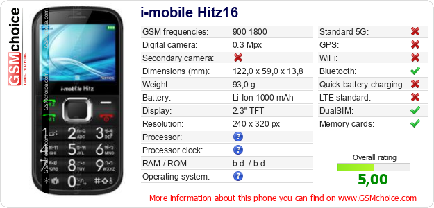 Do you have your website? Do you want to insert information about basic phone data of i-mobile Hitz16 somewhere? It is very easy. You can download the picture, or copy and paste the code below on the page:Pasting this code will display the following image: