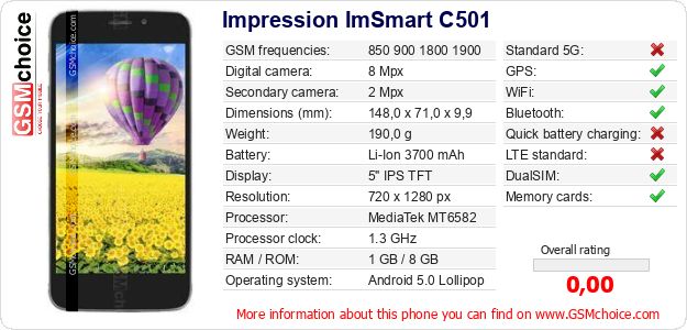 Do you have your website? Do you want to insert information about basic phone data of Impression ImSmart C501 somewhere? It is very easy. You can download the picture, or copy and paste the code below on the page:Pasting this code will display the following image: