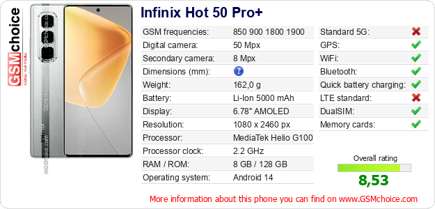 Do you have your website? Do you want to insert information about basic phone data of Infinix Hot 50 Pro+ somewhere? It is very easy. You can download the picture, or copy and paste the code below on the page:Pasting this code will display the following image: