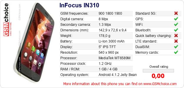 Do you have your website? Do you want to insert information about basic phone data of InFocus IN310 somewhere? It is very easy. You can download the picture, or copy and paste the code below on the page:Pasting this code will display the following image: