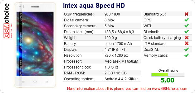 Do you have your website? Do you want to insert information about basic phone data of Intex aqua Speed HD somewhere? It is very easy. You can download the picture, or copy and paste the code below on the page:Pasting this code will display the following image: