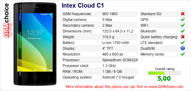Do you have your website? Do you want to insert information about basic phone data of Intex Cloud C1 somewhere? It is very easy. You can download the picture, or copy and paste the code below on the page:Pasting this code will display the following image: