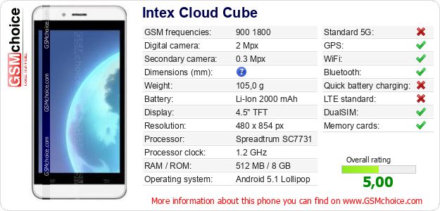 Do you have your website? Do you want to insert information about basic phone data of Intex Cloud Cube somewhere? It is very easy. You can download the picture, or copy and paste the code below on the page:Pasting this code will display the following image: