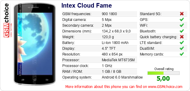 Do you have your website? Do you want to insert information about basic phone data of Intex Cloud Fame somewhere? It is very easy. You can download the picture, or copy and paste the code below on the page:Pasting this code will display the following image: