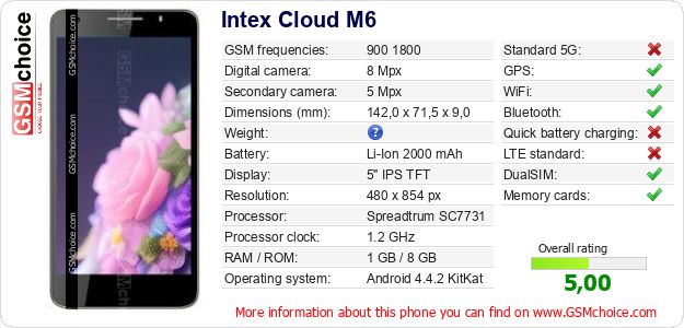 Do you have your website? Do you want to insert information about basic phone data of Intex Cloud M6 somewhere? It is very easy. You can download the picture, or copy and paste the code below on the page:Pasting this code will display the following image: