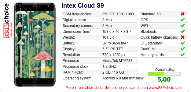 Do you have your website? Do you want to insert information about basic phone data of Intex Cloud S9 somewhere? It is very easy. You can download the picture, or copy and paste the code below on the page:Pasting this code will display the following image: