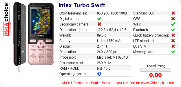 Do you have your website? Do you want to insert information about basic phone data of Intex Turbo Swift somewhere? It is very easy. You can download the picture, or copy and paste the code below on the page:Pasting this code will display the following image:
