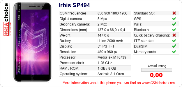 Do you have your website? Do you want to insert information about basic phone data of Irbis SP494 somewhere? It is very easy. You can download the picture, or copy and paste the code below on the page:Pasting this code will display the following image: