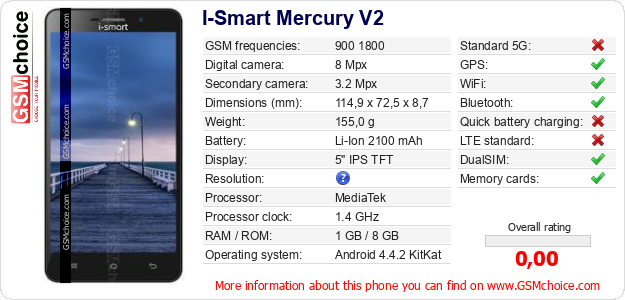 Do you have your website? Do you want to insert information about basic phone data of I-Smart Mercury V2 somewhere? It is very easy. You can download the picture, or copy and paste the code below on the page:Pasting this code will display the following image: