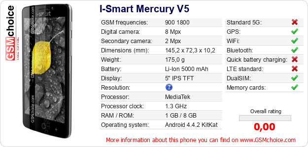 Do you have your website? Do you want to insert information about basic phone data of I-Smart Mercury V5 somewhere? It is very easy. You can download the picture, or copy and paste the code below on the page:Pasting this code will display the following image: