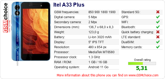Do you have your website? Do you want to insert information about basic phone data of Itel A33 Plus somewhere? It is very easy. You can download the picture, or copy and paste the code below on the page:Pasting this code will display the following image:
