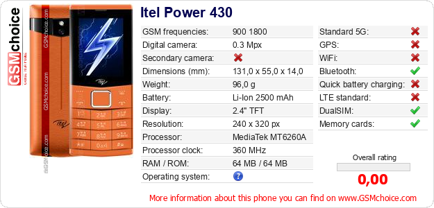 Do you have your website? Do you want to insert information about basic phone data of Itel Power 430 somewhere? It is very easy. You can download the picture, or copy and paste the code below on the page:Pasting this code will display the following image: