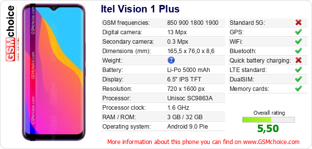 Do you have your website? Do you want to insert information about basic phone data of Itel Vision 1 Plus somewhere? It is very easy. You can download the picture, or copy and paste the code below on the page:Pasting this code will display the following image: