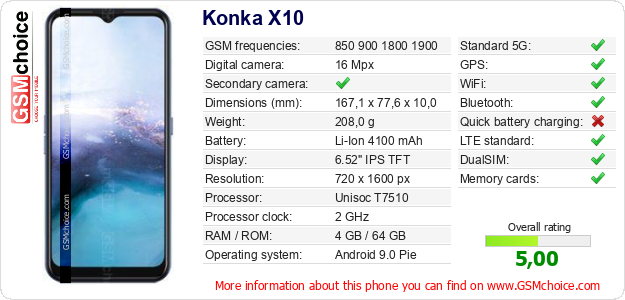 Do you have your website? Do you want to insert information about basic phone data of Konka X10 somewhere? It is very easy. You can download the picture, or copy and paste the code below on the page:Pasting this code will display the following image:
