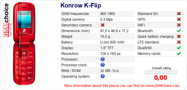 Do you have your website? Do you want to insert information about basic phone data of Konrow K-Flip somewhere? It is very easy. You can download the picture, or copy and paste the code below on the page:Pasting this code will display the following image: